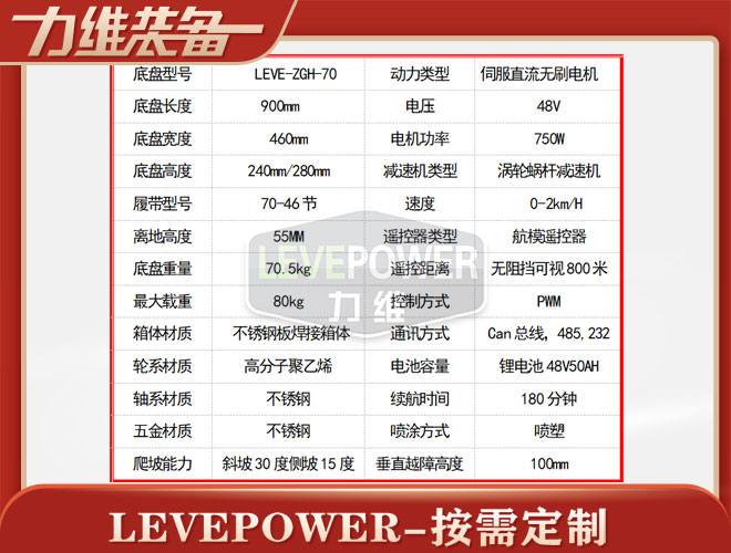 履帶底盤長(zhǎng)900mm,履帶底盤寬460mm,履帶底盤高280mm,無線遙控履帶底盤箱體采用鋁合金材質(zhì)焊接而成,防腐性能好。履帶底盤動(dòng)力采用48V750W直流無刷電機(jī),渦輪蝸桿減速機(jī)動(dòng)力更強(qiáng),轉(zhuǎn)彎靈活。履帶底盤電池采用48V20AH鋰電池,續(xù)航時(shí)間更長(zhǎng),是一款不錯(cuò)的機(jī)器人橡膠履帶。