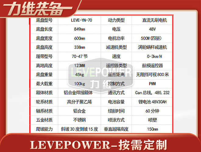 橡膠履帶底盤長849mm,履帶底盤寬600mm,履帶底盤高338mm,無線遙控履帶底盤搭載48V500W直流永磁無刷電機(jī),RV渦輪蝸桿減速機(jī)動力更強(qiáng),爬坡更有勁。